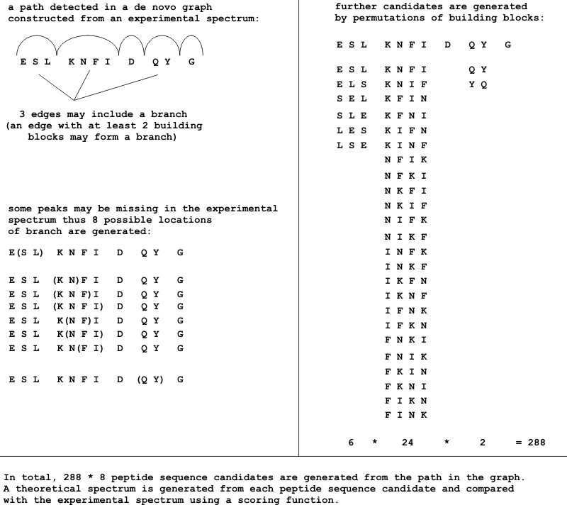 Since peaks determining the begin and the end of a branch may be missing in an experimental spectrum, the algorithm generates a set of peptide sequence candidates from a path in the graph instead of one sequence candidate. See the following scheme.