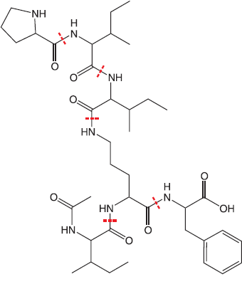 A scheme of theoretical fragments generated from a linearized pseudacyclin A is shown in the following picture. We assume that a ion of a branched peptide is fragmented only once and that the branch is not fragmented, thus some b-ions and y-ions do not exist in the theoretical spectrum (struck out in the following picture). If a branch was split, the ion would be fragmented for second time.