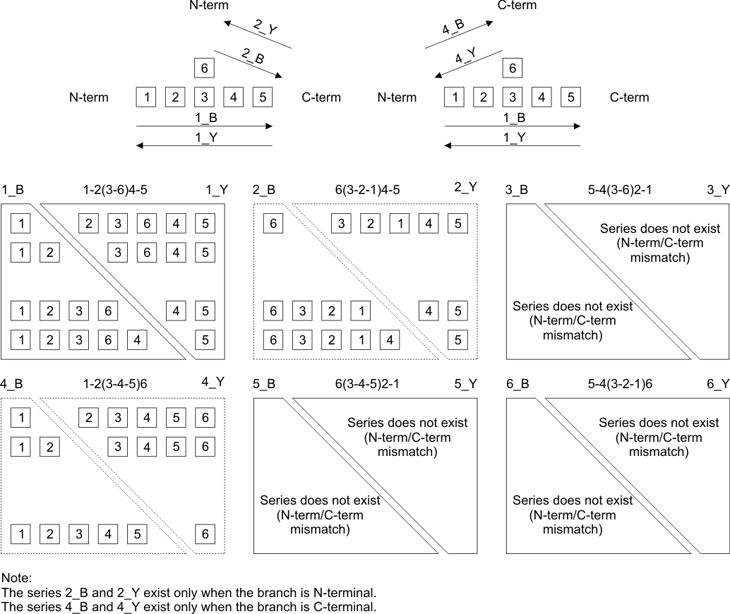 In the following picture, you can see a general scheme of a fragmentation of a singly branched peptide. A sequence of a branched peptide can be written by six different ways (called linearized sequences of a branched peptide sequence). Two series of ions can be generated from each linearized sequence (N-terminal and C-terminal), thus we get series of fragment ions 1B to 6B and 1Y to 6Y. However, the series 3B, 5B and 6B are unsense because N-terminal fragments cannot be generated from a C-terminal side. Similarly, the series 3Y, 5Y and 6Y are unsense because C-terminal fragments cannot be generated from an N-terminal side. The series 2B and 2Y exist only when the branch is N-terminal. The series 4B and 4Y exist only when the branch is C-terminal. Thus for a branched peptide, only four series of fragment ions can be observed in total - two series of b-ions (N-terminal ions) and two series of y-ions (C-terminal ions).