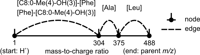 In the following scheme, beauverolide I is detected. Since the peak between m/z 1 and 304 is missing, the minimum values start/middle/end are 2/1/1. Otherwise, beauverolide I is not detected when "Incomplete Paths in De Novo Graph" is set up to "keep" or "remove".