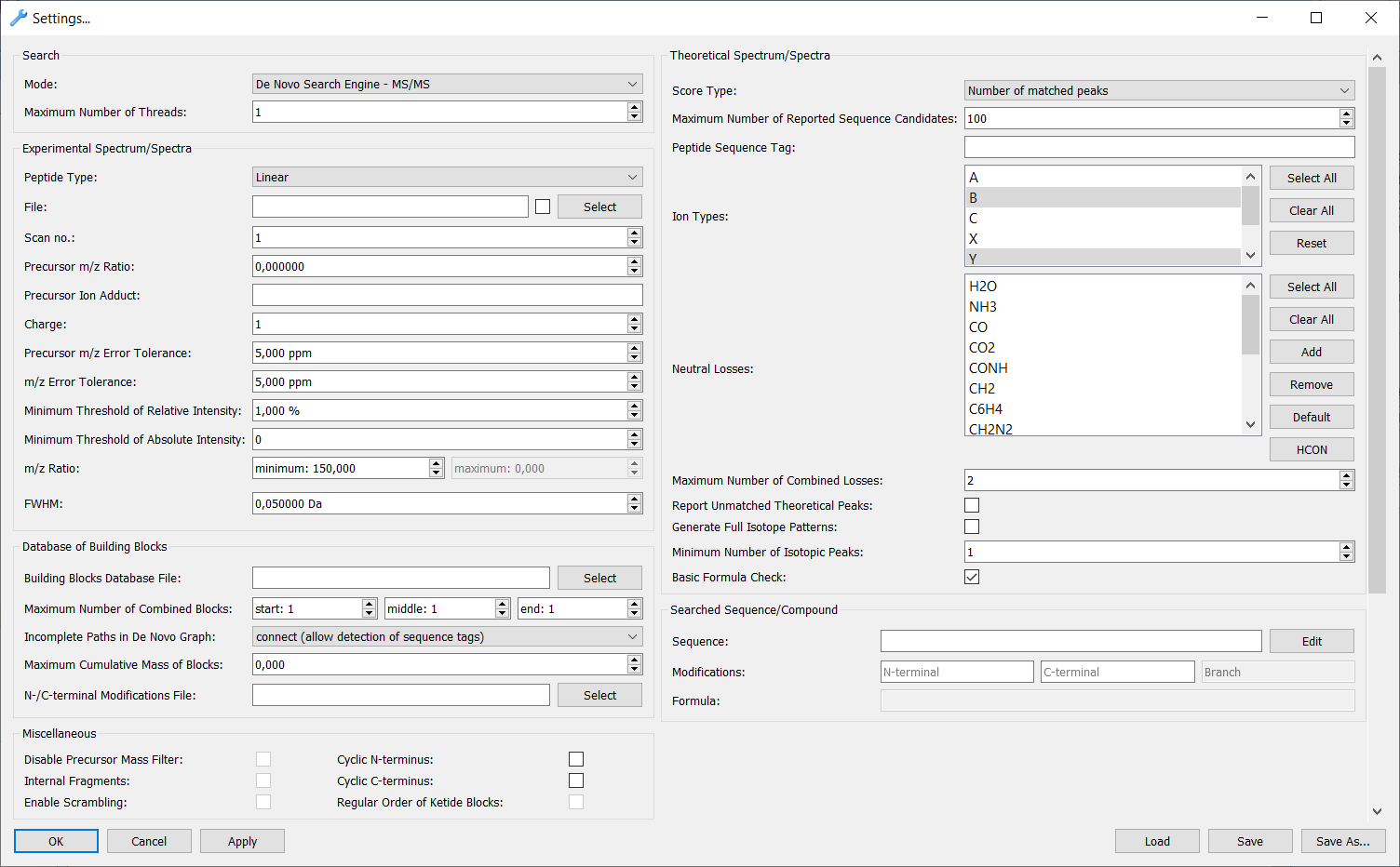 This page describes only a selection of parameters important for 'De Novo Search Engine - MS/MS' mode. For other parameters, see the page for dereplication mode.