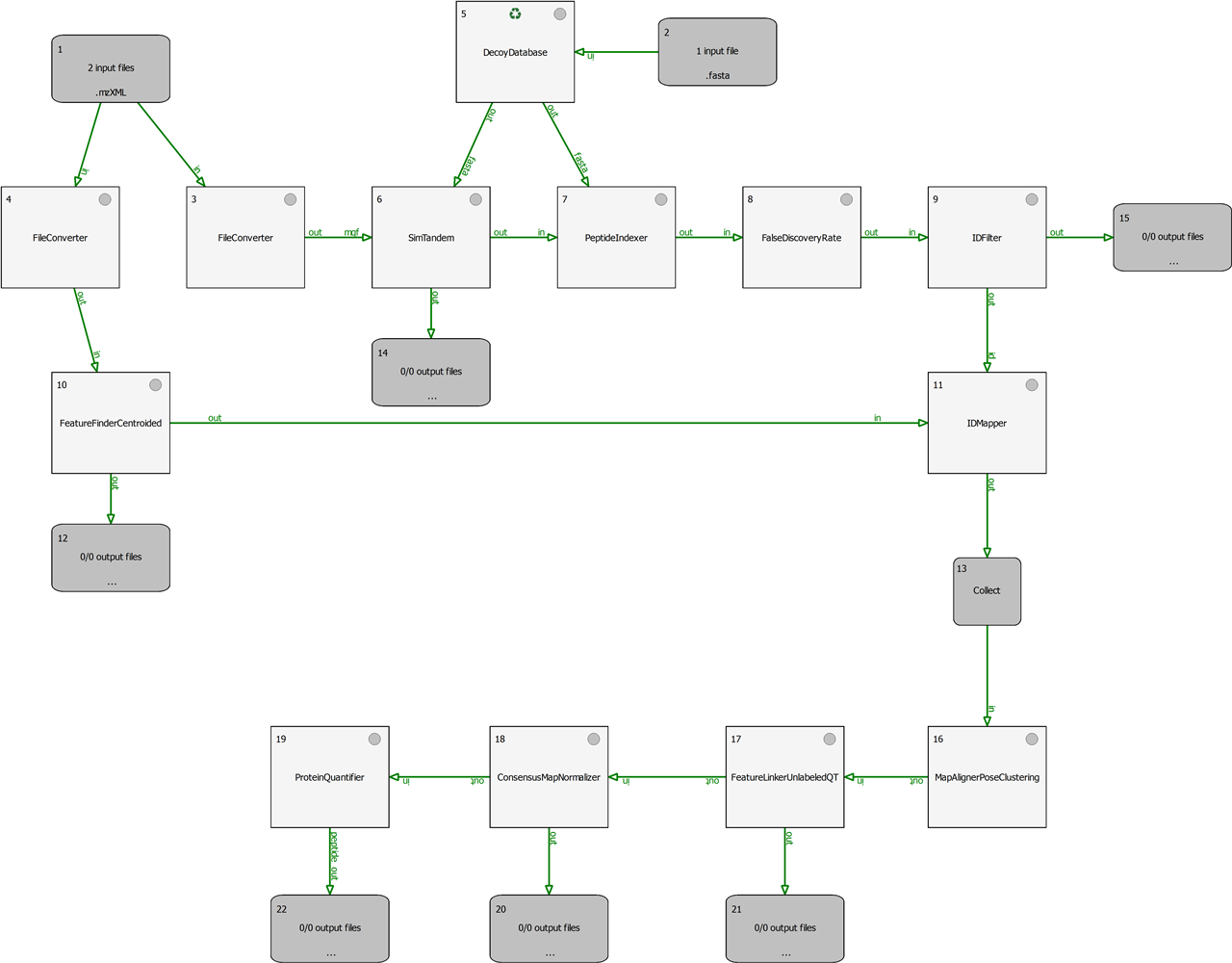 7. Connect input files *.mgf and *.fasta with SimTandem and connect also the output *.IdXML file with an output box or another tool.